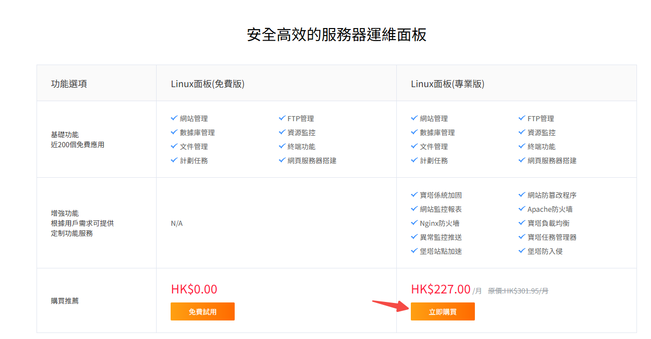 3、进入购买页面,选择需要购买的面板类型。目前支持购买Linux类型的面板授权码。