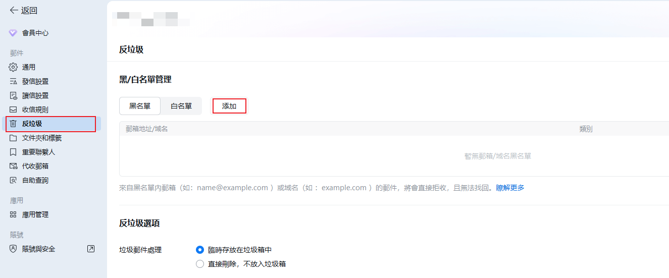 您會看到在“設定”目錄下有很多選項,點擊“反垃圾”按鈕, 找到“添加”