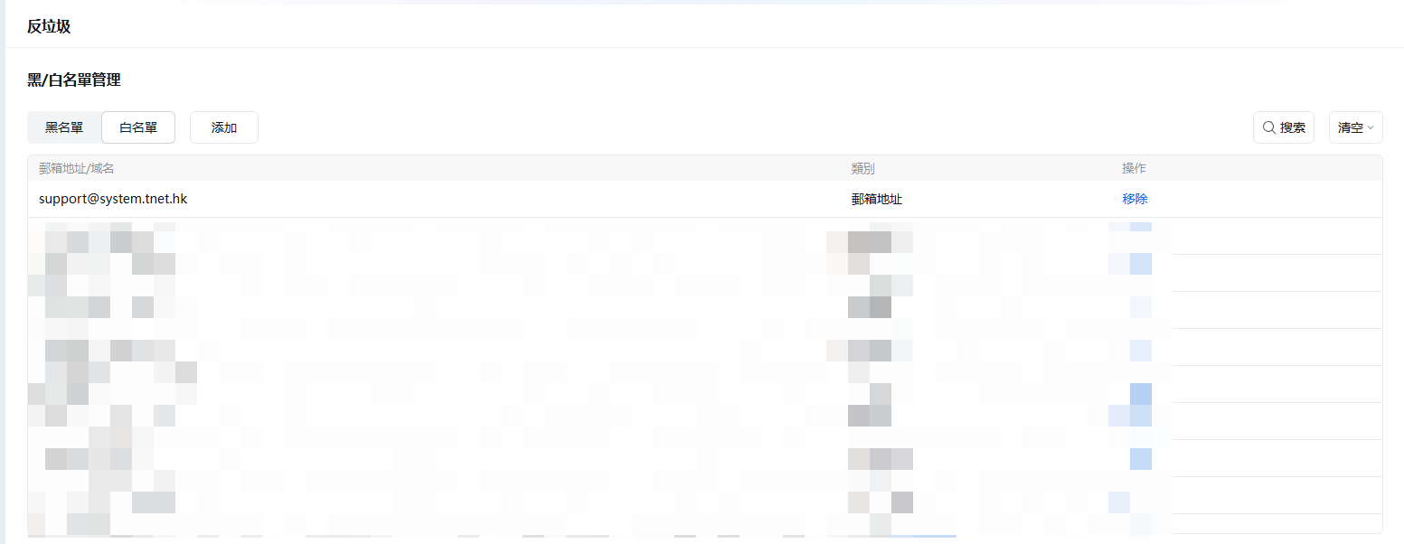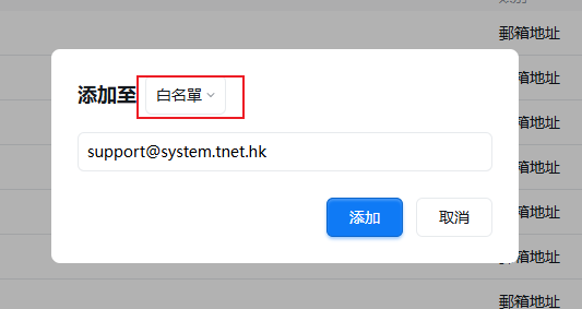 選擇白名單,在對話方塊中輸入「support@system.tnet.hk」,之後點添加」即可;
