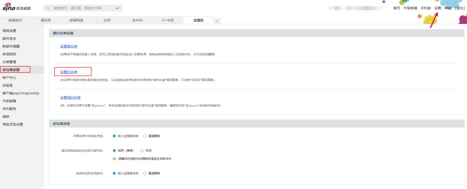 您會看到在“設定”目錄下有很多選項,點擊“反垃圾設置”按鈕, 找到“設置白名單”