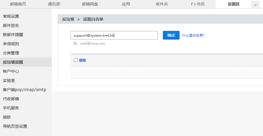 二、在郵箱格式確認沒有問題的情況下,依然接收不到本站發送的驗證碼郵件,可嘗試在您的郵箱-設定中,將時代互聯的郵箱添加至白名單;添加白名單之後,可嘗試重新發送系統郵件。 【時代互聯信箱位址:support@system.tnet.hk】
